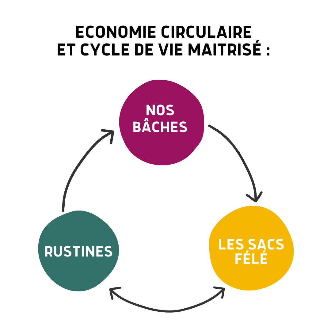 Nous réutilisons les chutes de bâches des projets Bâche 21 et de ses clients pour créer des sacs éco-conçus avec une matière neuve et de haute qualité.
